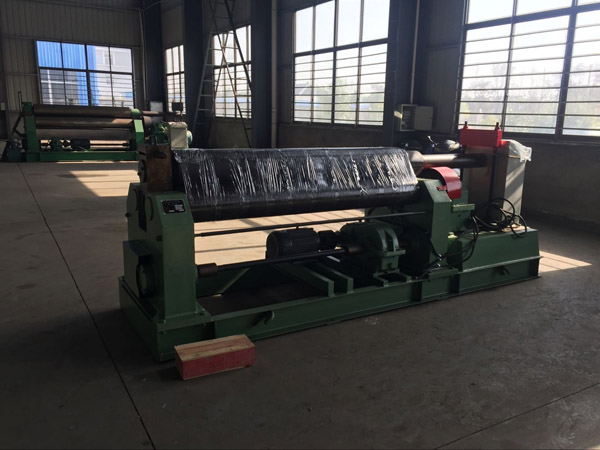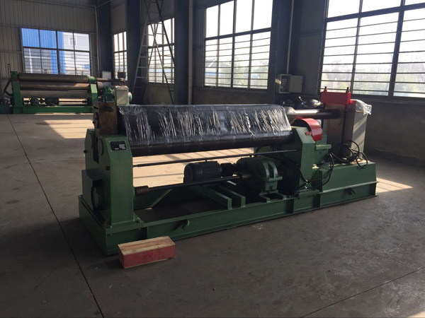 本機結構型式為三輥對稱式卷板機,上輥在兩下輥中央對稱位置作垂直升降運動,通過絲桿絲母蝸桿傳動而獲得,兩下輥作旋轉運動,通過減速機的輸出齒輪與下輥嚙合,為卷制板材提供扭矩,本機床結構緊湊,操作維修方便。